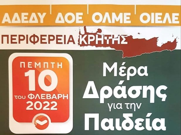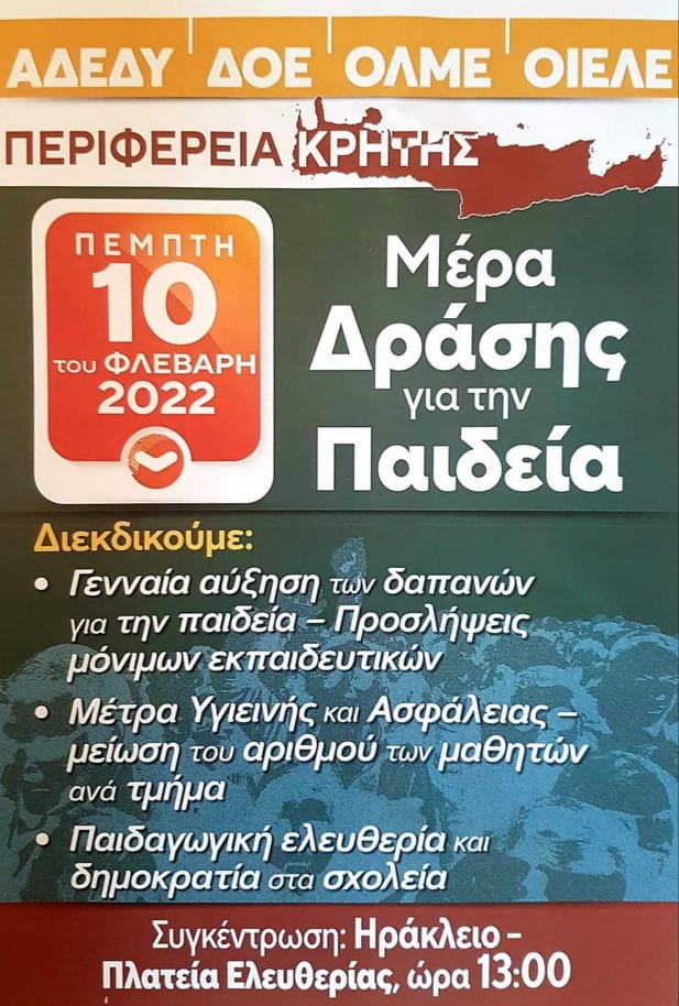 Για να διευκολυνθούν οι εργαζόμενοι να συμμετέχουν στις κινητοποιήσεις η Εκτελεστική Επιτροπή της Α.Δ.Ε.Δ.Υ. κηρύσσει Στάση Εργασίας για όλους τους εργαζόμενους στο Δημόσιο για την περιφέρεια της Κρήτης (Ηράκλειο, Χανιά, Ρέθυμνο, Λασίθι) την Πέμπτη, 10 του Φλεβάρη του 2022, από τις 12:00 έως τη λήξη του ωραρίου.