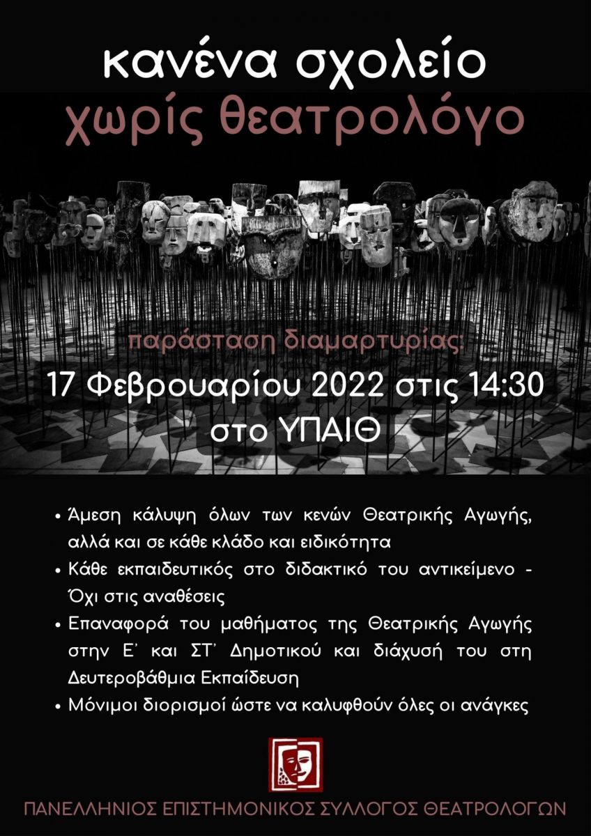 Tο Διοικητικό Συμβούλιο του Συλλόγου Εκπαιδευτικών Πρωτοβάθμιας Εκπαίδευσης Νομού Ρεθύμνου, στηρίζει τόσο τον αγώνα του Πανελλήνιου Επιστημονικού Συλλόγου Θεατρολόγων , όσο και τη δράση που θα πραγματοποιηθεί αύριο Πέμπτη 17 Φεβρουαρίου 2022, στη Μεγάλη Πόρτα στην πλατεία των Τεσσάρων Μαρτύρων στις 14:30, από καθηγητές θεατρικής αγωγής του Νομού Ρεθύμνου.