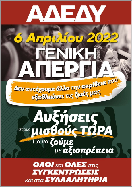 24ΩΡΗ ΠΑΝΕΛΛΑΔΙΚΗ ΑΠΕΡΓΙΑ ΠΟΥ ΕΞΗΓΓΕΙΛΕ Η ΑΔΕΔΥ ΚΑΙ Η Γ.Σ.Ε.Ε ΓΙΑ ΤΙΣ 6 ΑΠΡΙΛΙΟΥ 2022