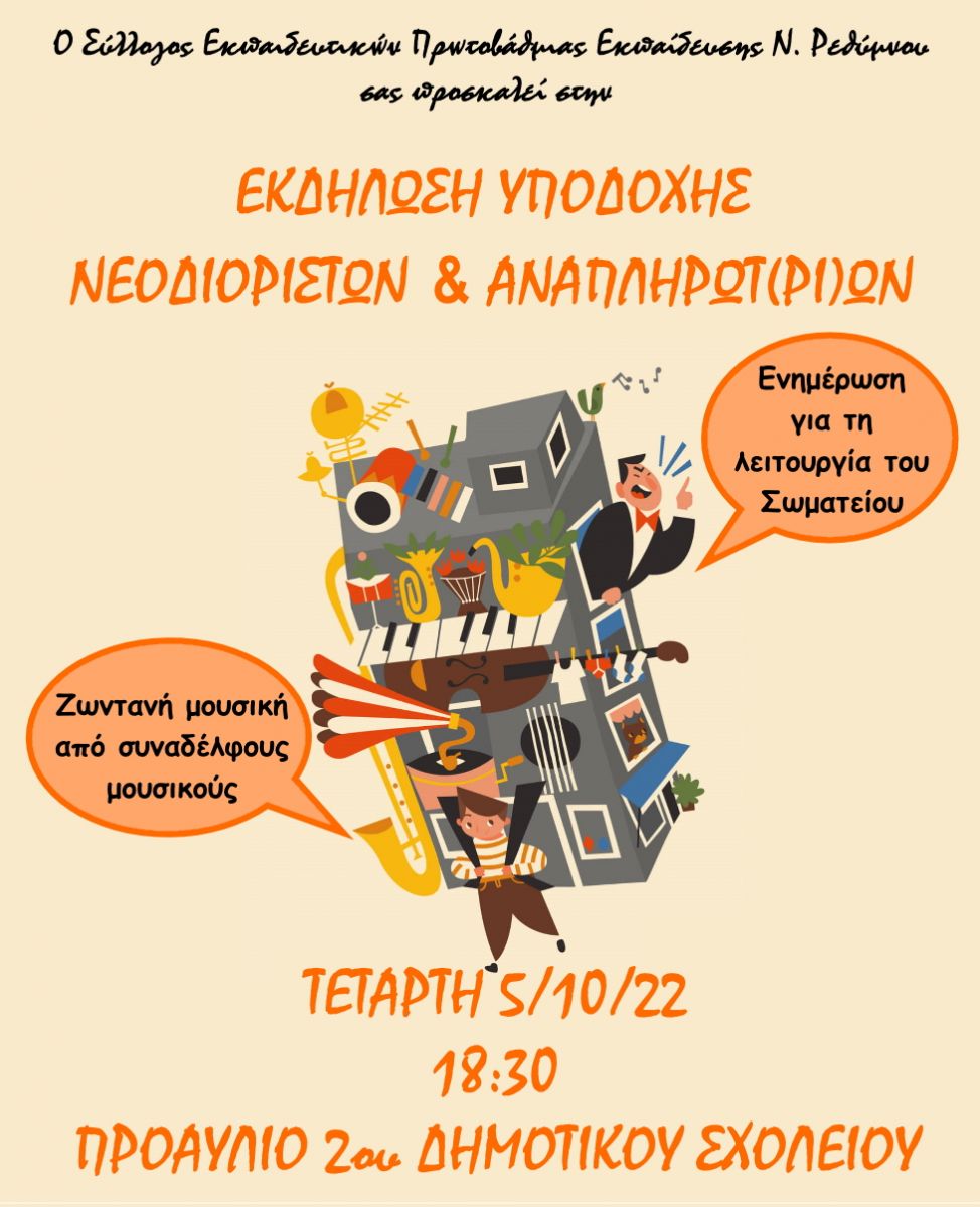 Το Διοικητικό Συμβούλιο του Συλλόγου Εκπαιδευτικών Πρωτοβάθμιας Εκπαίδευσης Νομού Ρεθύμνου σας προσκαλεί στην εκδήλωση υποδοχής των νεοδιόριστων και αναπληρωτ(ρι)ών συναδέλφων την Τετάρτη 5 Οκτωβρίου στις 18:30 στο προαύλιο του 2ου Δημοτικού Σχολείου.