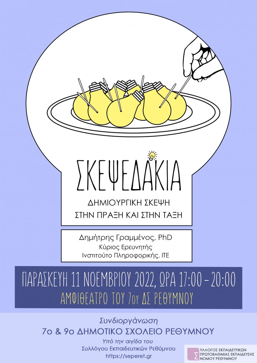 Ένα ταχύρρυθμο εργαστήριο που προσφέρει μια βιωματική και παιγνιώδη εισαγωγή στη Δημιουργική Σκέψη και τη Δημιουργικότητα και το πώς αυτές μπορούν να αξιοποιηθούν στην πράξη και στην τάξη. Το εργαστήριο έχει ως βασικό στόχο την έμπνευση μέσα από τη διασκέδαση, καθώς και να ανοίξει την όρεξη των συμμετεχόντων για δημιουργική σκέψη και ένταξή της στην εκπαιδευτική τους πρακτική.