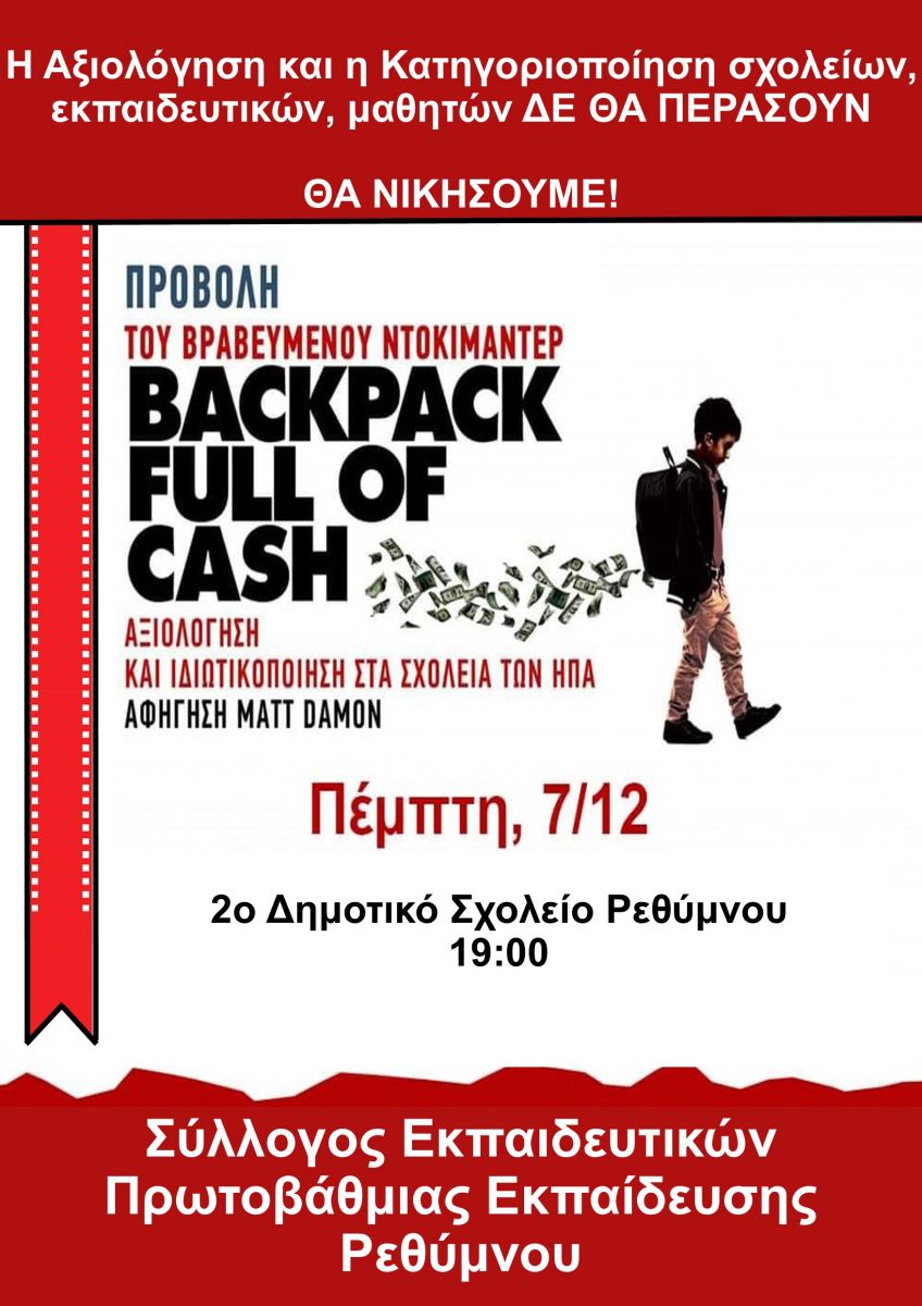 Το διοικητικό συμβούλιο του Σ.Ε.Π.Ε. Ρεθύμνου αποφάσισε να προβάλλει την ταινία «Backpack full of cash», την Πέμπτη 7 Δεκεμβρίου 2023, στις 19:00 στο αμφιθέατρο του 2ου Δημοτικού Σχολείου Ρεθύμνου, που αναφέρεται στην αξιολόγηση και ιδιωτικοποίηση των σχολείων των ΗΠΑ.