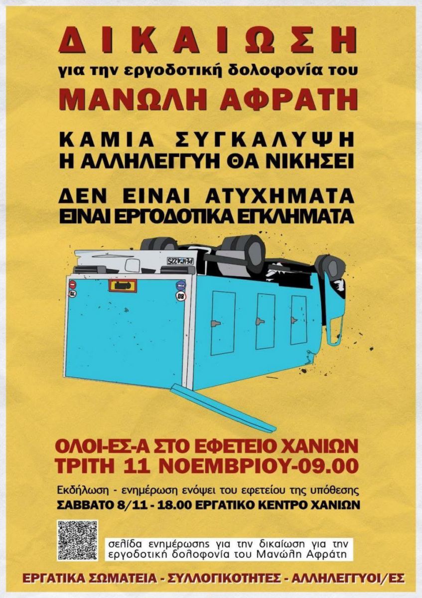 Καλούμε όλους τους συναδέλφους και όλες τις συναδέλφισσες, καθώς και κάθε εργαζόμενο/η, να στηρίξουν τον αγώνα για δικαιοσύνη και να συμμετάσχουν στην παράσταση αλληλεγγύης την Τρίτη 11 Νοεμβρίου 2025, στις 09:00 π.μ., στο Εφετείο Χανίων.