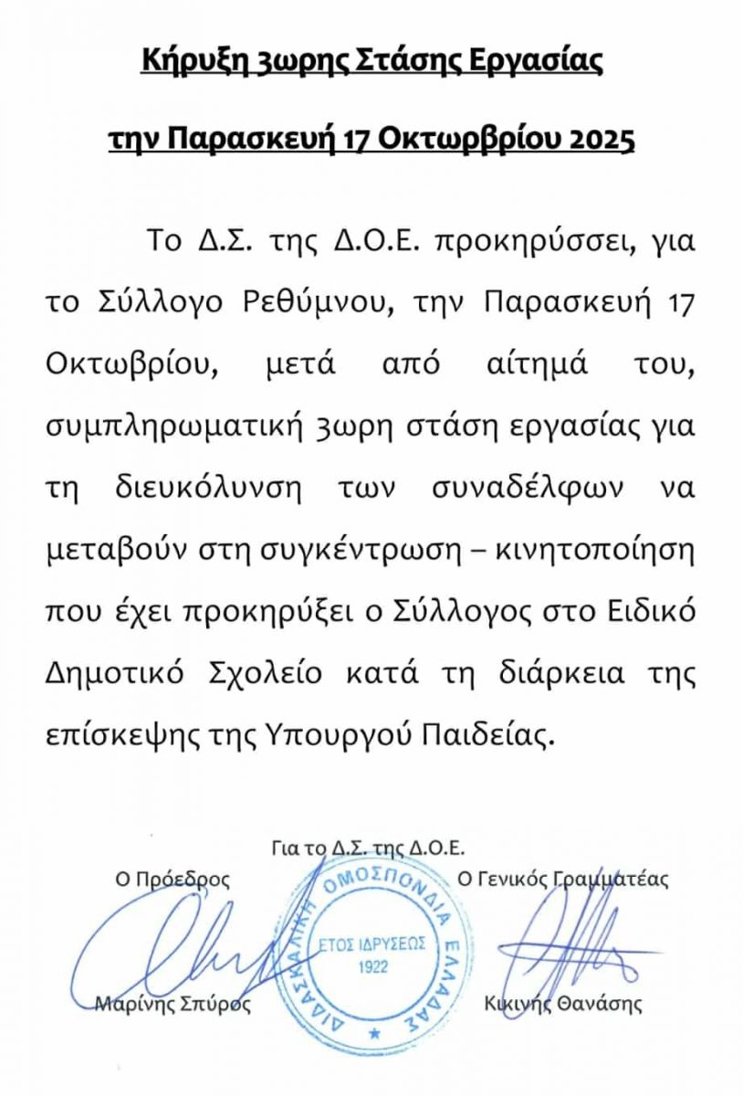 Ο Σύλλογος Εκπαιδευτικών Π.Ε. Ρεθύμνου καλεί τα μέλη του, όλα τα πρωτοβάθμια σωματεία του νομού — εργατικά, εκπαιδευτικά, δημόσιου και ιδιωτικού τομέα, τους φοιτητικούς συλλόγους και τις συλλογικότητες της πόλης— σε μαζική, ενωτική και αγωνιστική κινητοποίηση την Παρασκευή 17 Οκτωβρίου, στο Ειδικό Δημοτικό, στις 10:00 κατά τη διάρκεια της επίσκεψης της Υπουργού Παιδείας. Προκηρύσσουμε στάση εργασίας 1-3 ώρες ανάλογα με το εργασιακό ωράριο κάθε συναδέλφου και καλούμε τη ΔΟΕ να προκηρύξει άλλη μία τρίωρη στάση εργασίας.