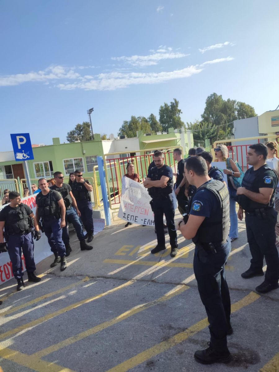 Παρά το γεγονός ότι δεν επιτράπηκε στους εκπαιδευτικούς να πλησιάσουν ούτε καν στα κάγκελα του σχολείου, την ίδια στιγμή παρήλασαν όλοι οι «επίσημοι» της διοίκησης —περίπου δεκαπέντε άτομα— μέσα στο προαύλιο, όπου υπήρχε έντονη αστυνομική παρουσία. Η εικόνα ήταν πρωτοφανής για τα δεδομένα του Ρεθύμνου: αυτοκίνητα με αναμμένους φάρους, ασφαλίτες και ειδικές αστυνομικές δυνάμεις μέσα στον χώρο του σχολείου.