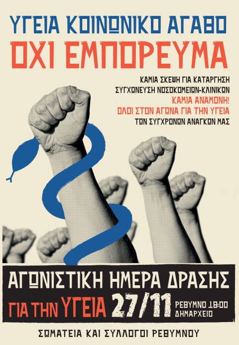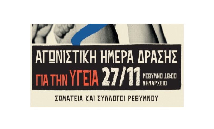 Να οργανωθεί από τα σωματεία και τους συλλόγους του Ρεθύμνου Πανρεθεμιώτικο Συλλαλητήριο για την Υγεία με συγκέντρωση στο Δημαρχείο του Ρεθύμνου στις 27 Νοεμβρίου στις 6μμ, στο πλαίσιο της Παγκρήτιας κοινής μέρας δράσης για την Υγεία του λαού την ημέρα αυτή σε όλους τους νομούς της Κρήτης.
