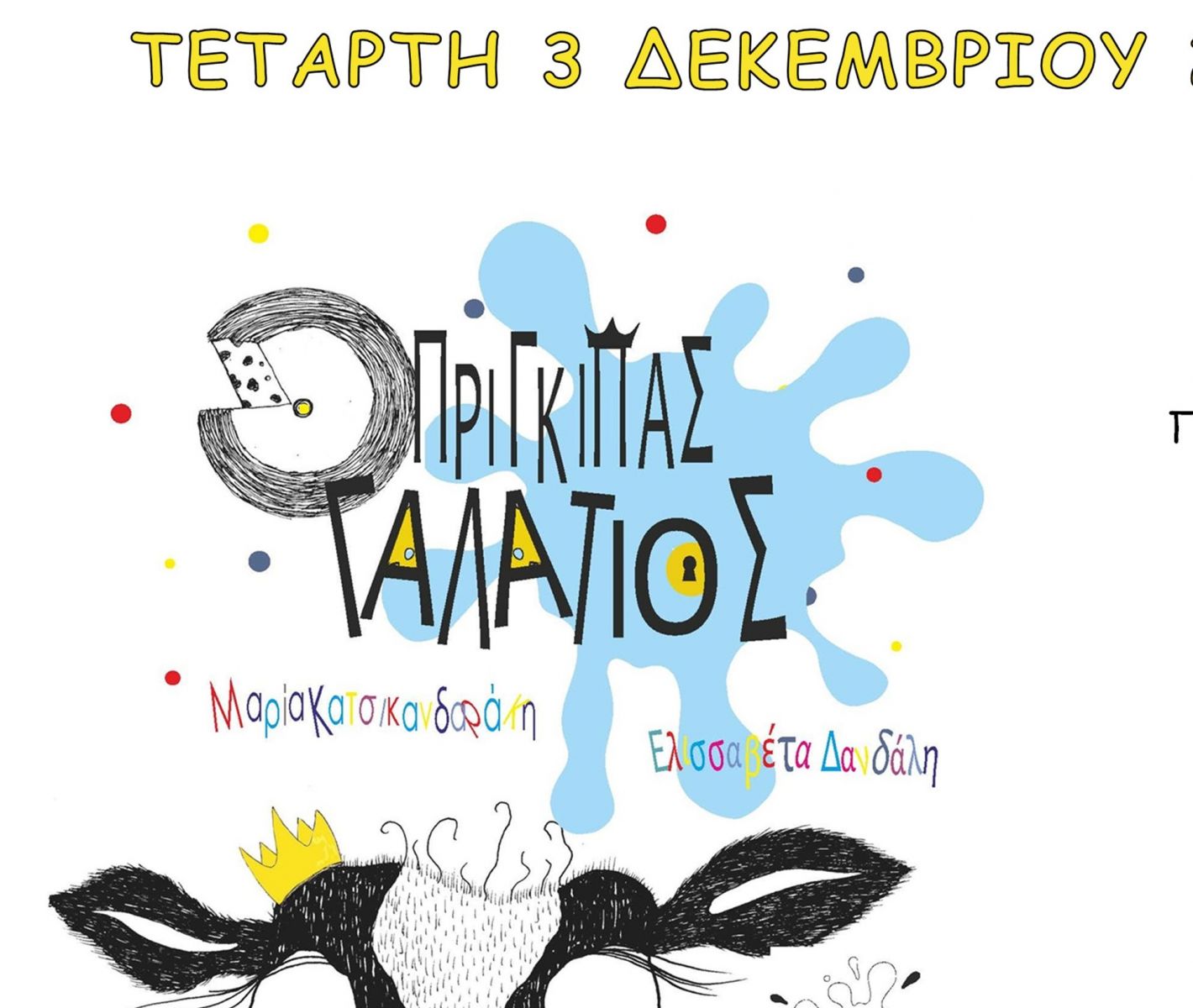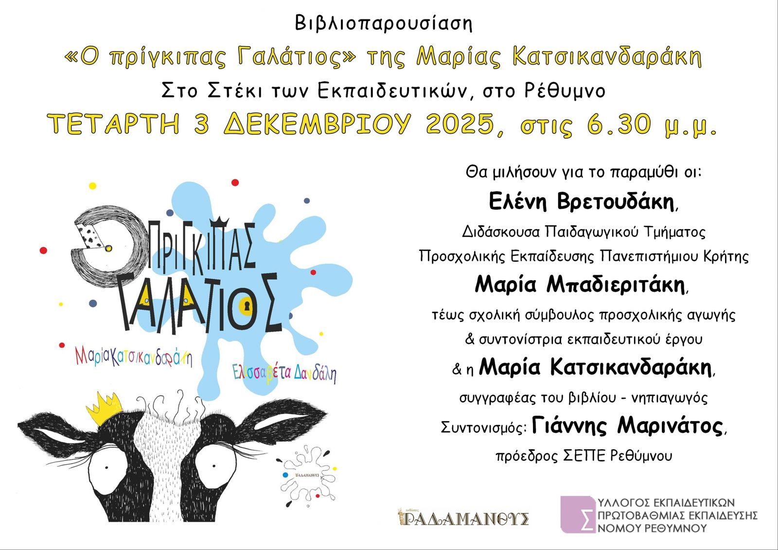 Ο Σύλλογος Εκπαιδευτικών Πρωτοβάθμιας Εκπαίδευσης Νομού Ρεθύμνου και οι Εκδόσεις Ραδάμανθυς παρουσιάζουν το παραμύθι της Μαρίας Κατσικανδαράκη «Ο πρίγκιπας Γαλάτιος», με εικονογράφηση της Ελισσάβετ Δανδάλη, την Τετάρτη 3 Δεκεμβρίου 2025, στις 6.30 το απόγευμα, στο Στέκι των Εκπαιδευτικών (Ηλιακάκη 16, Ρέθυμνο 741 50).