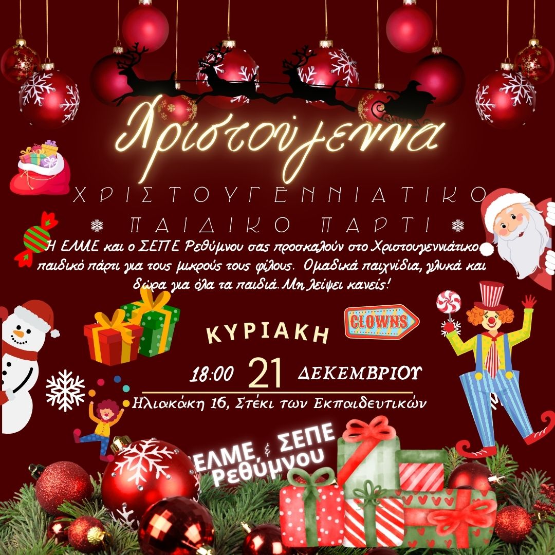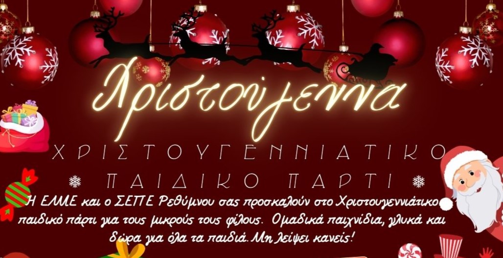 Φέτος ο Σύλλογός μας διοργανώνει μαζί με την ΕΛΜΕ Ρεθύμνου χριστουγεννιάτικη γιορτή για τα παιδιά των εκπαιδευτικών την Κυριακή 21 Δεκεμβρίου στις 18.00 στο Στέκι των Εκπαιδευτικών (Ηλιακάκη 16).