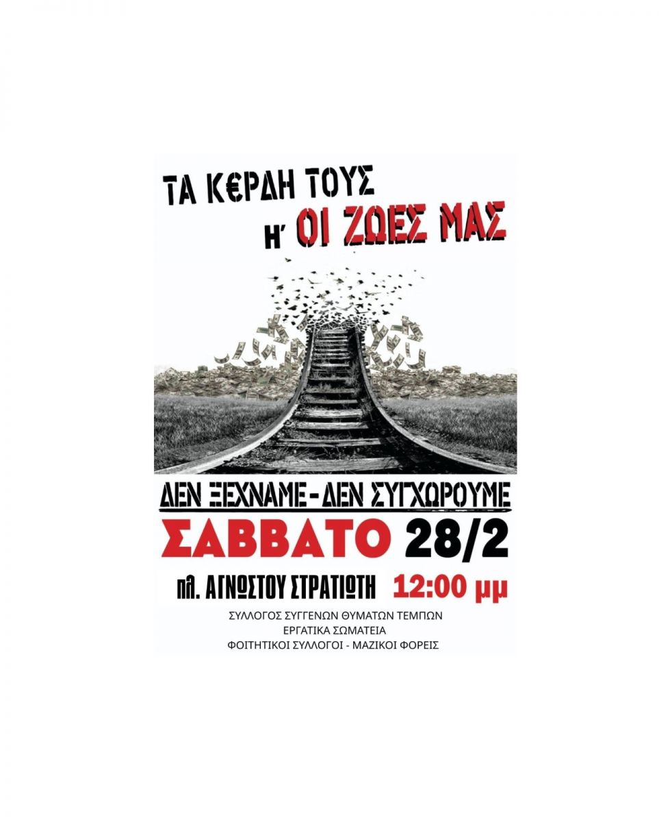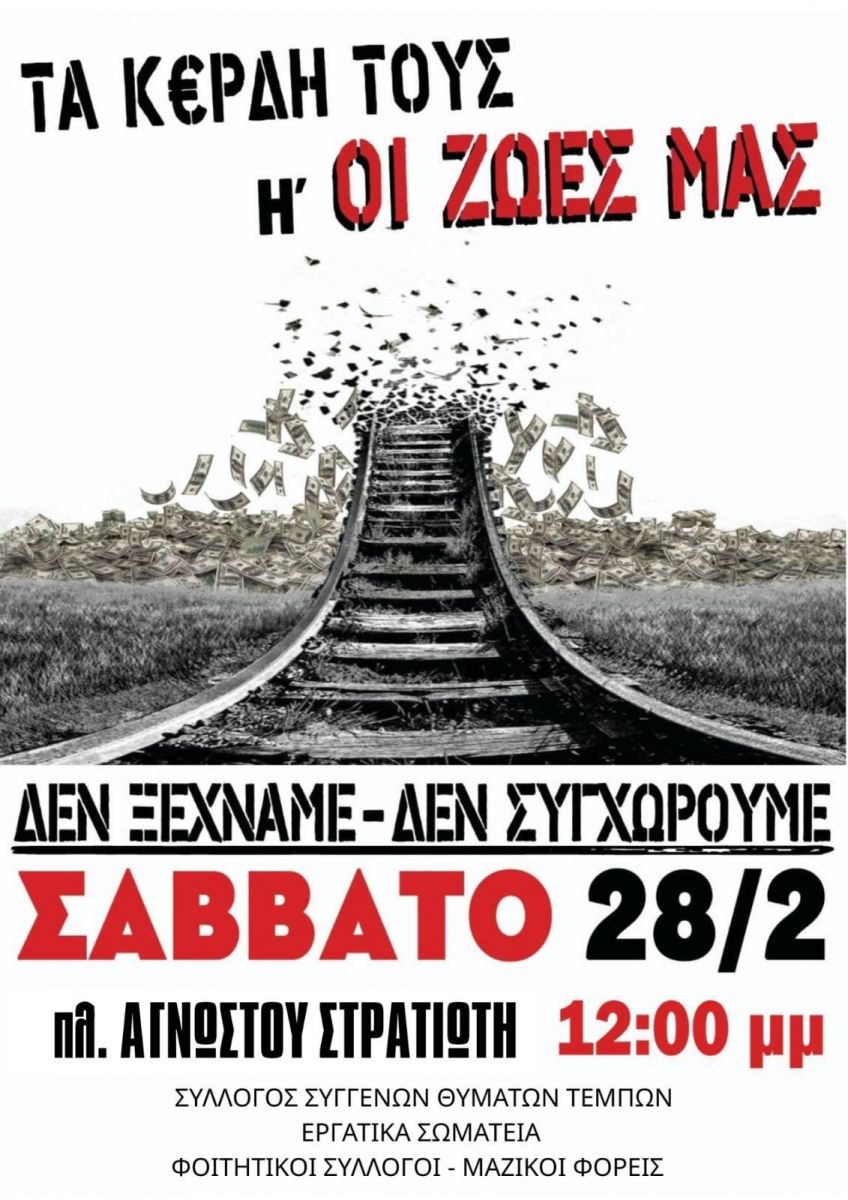 Όλοι και όλες στο συλλαλητήριο για τα 3 χρόνια από το έγκλημα στα Τέμπη που θα πραγματοποιηθεί το Σάββατο 28 Φεβρουαρίου στις 12:00 στην Πλατεία Αγνώστου Στρατιώτη.
