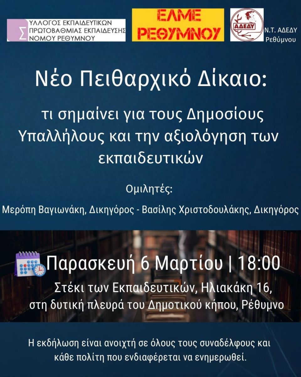 Η Ένωση Λειτουργών Μέσης Εκπαίδευσης, ο Σύλλογος Εκπαιδευτικών Πρωτοβάθμιας και το Νομαρχιακό Τμήμα της ΑΔΕΔΥ Ρεθύμνου διοργανώνουν ενημερωτική εκδήλωση για το Νέο Πειθαρχικό Δίκαιο των Δημοσίων Υπαλλήλων (και πώς αυτό σχετίζεται και με την αξιολόγηση των εκπαιδευτικών) την Παρασκευή 6 Μαρτίου στις 18.00 στο Στέκι Εκπαιδευτικών (Ηλιακάκη 16, στη δυτική πλευρά του Δημοτικού Κήπου). Ομιλητές θα είναι η κυρία Μερόπη Βαγιωνάκη, δικηγόρος, και ο κύριος Βασίλης Χριστοδουλάκης, δικηγόρος - Δρ. Νομικής. Η εκδήλωση είναι ανοιχτή για το κοινό.