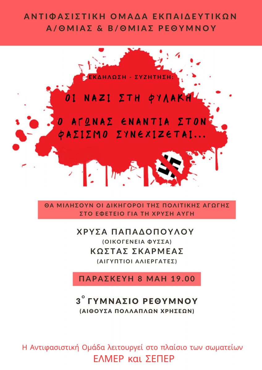Με αφορμή την τελεσίδικη καταδίκη της Χρυσής Αυγής ως εγκληματικής οργάνωσης η Αντιφασιστική Ομάδα Εκπαιδευτικών Πρωτοβάθμιας και Δευτεροβάθμιας Ρεθύμνου διοργανώνει την Παρασκευή 8 Μαΐου στις 19:00 στην αίθουσα πολλαπλών χρήσεων του 3ου Γυμνασίου την εκδήλωση Οι ΝΑΖΙ στη Φυλακή! Ο αγώνας ενάντια στον φασισμό συνεχίζεται... με τους δικηγόρους της πολιτικής αγωγής Χρύσα Παπαδοπούλου (οικογένεια Φύσσα) και Κώστα Σκαρμέα (Αιγύπτιοι αλιεργάτες).